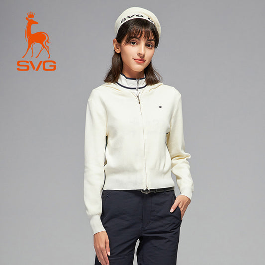 SVG Golf Women's White Sheep Wool Zipper Hooded Jacket Knitted Sweater