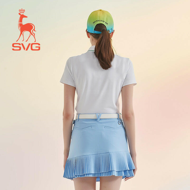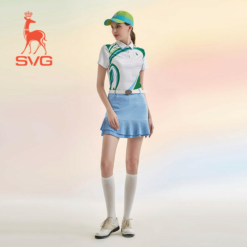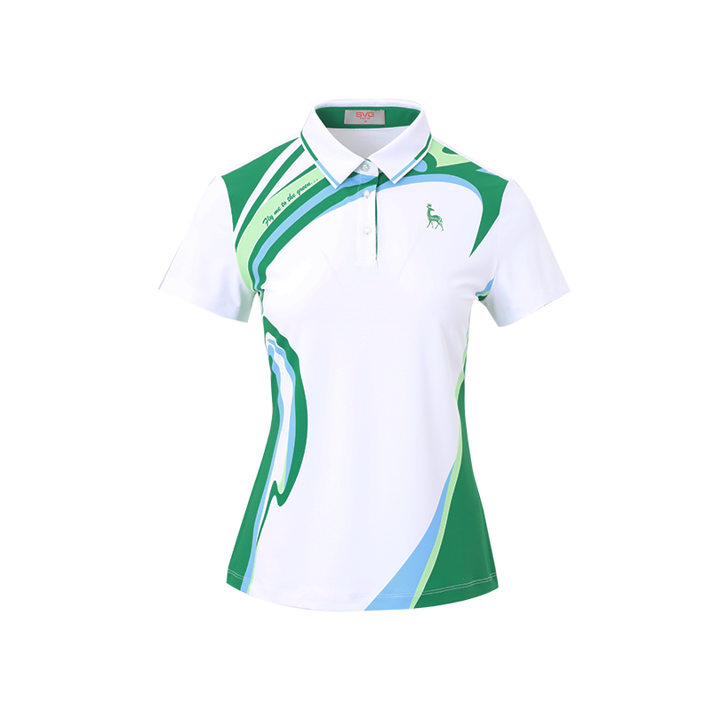 Introducing the SVG Golf Women's Wave-Print Polo from the 23 Spring and Summer Collection. Crafted from textured knitted fabrics, this polo offers a blend of skin-friendly comfort and breathability. The vibrant blue and green wave-like print adds a youthful and energetic touch to your style. The classic lapel design enhances the simplicity and wearability of this shirt. Experience effortless elegance and comfort with SVG Golf – where fashion meets functionality on the golf course.