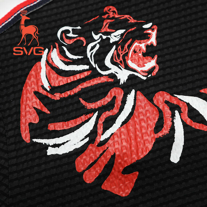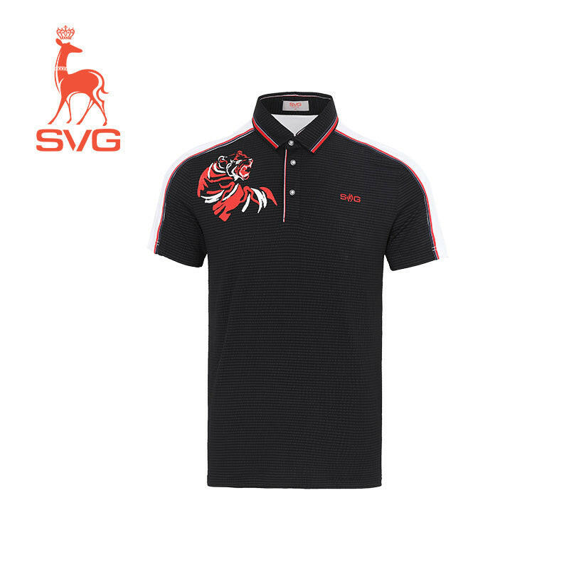 The SVG Golf Printed Polo has a contrasting stripe on the collar and a sporty tiger pattern on the front.
